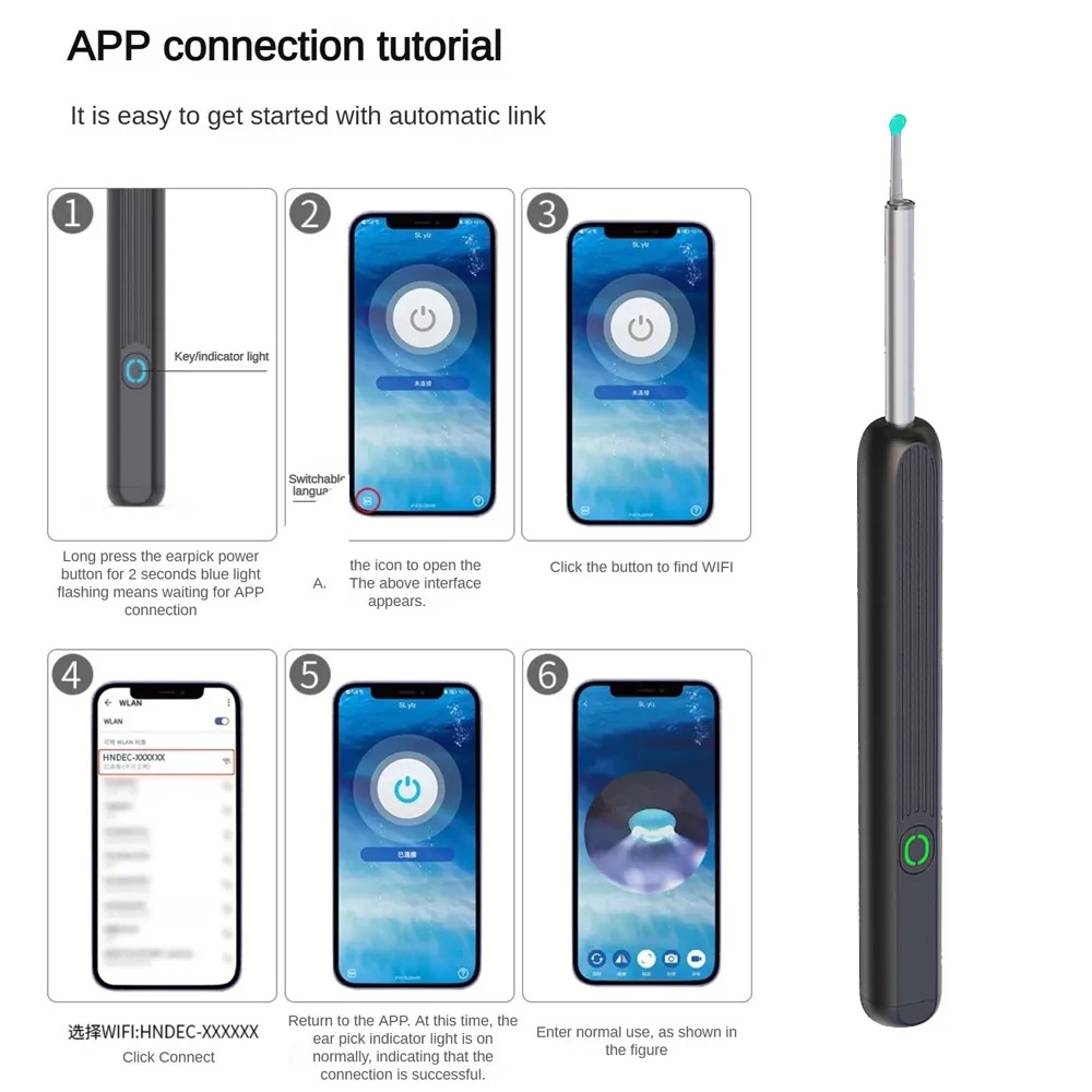 【Smart App Connection】 Scan the QR code and download the APP. Press and hold the switch button to turn it on, and connect the ear cleaner and APP through WiFi, and video transmission rate up to 30FPS, The ear cleaner camera is compatible with iOS / Android devices. You can also take photos or shoot videos and save them in the album.