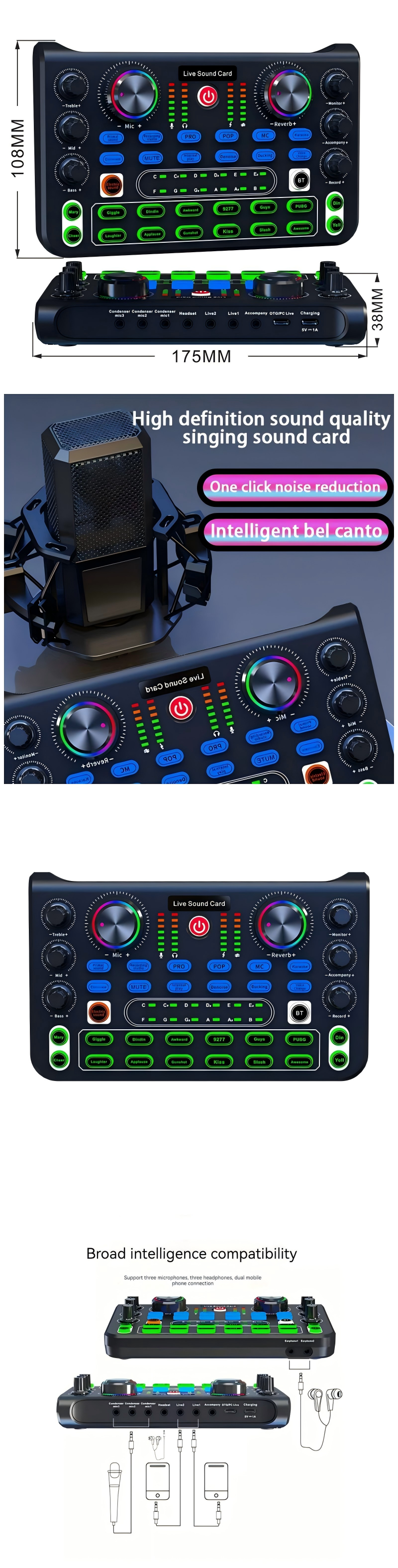 1. Multi-function audio card, complete functions, easy operation, easy to use, built-in lithium battery. Common in mobile phones and computers.