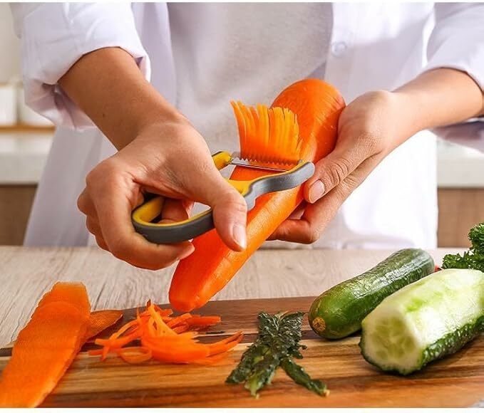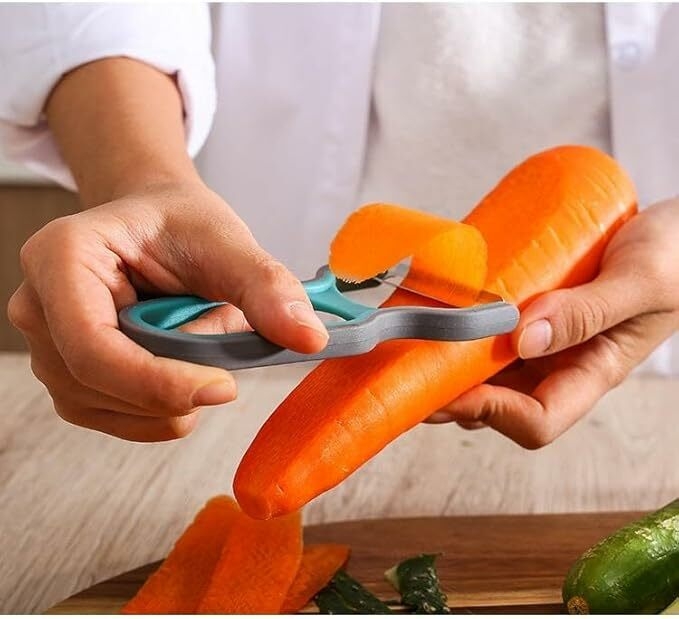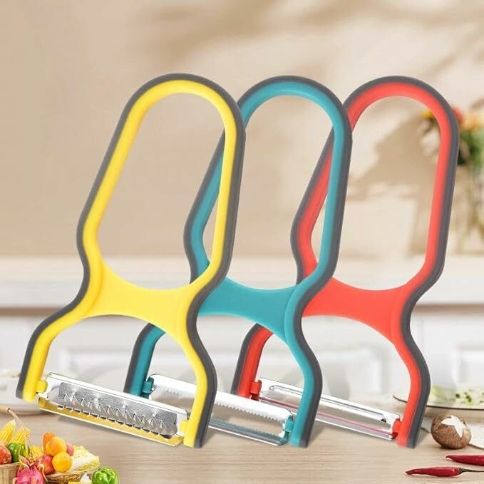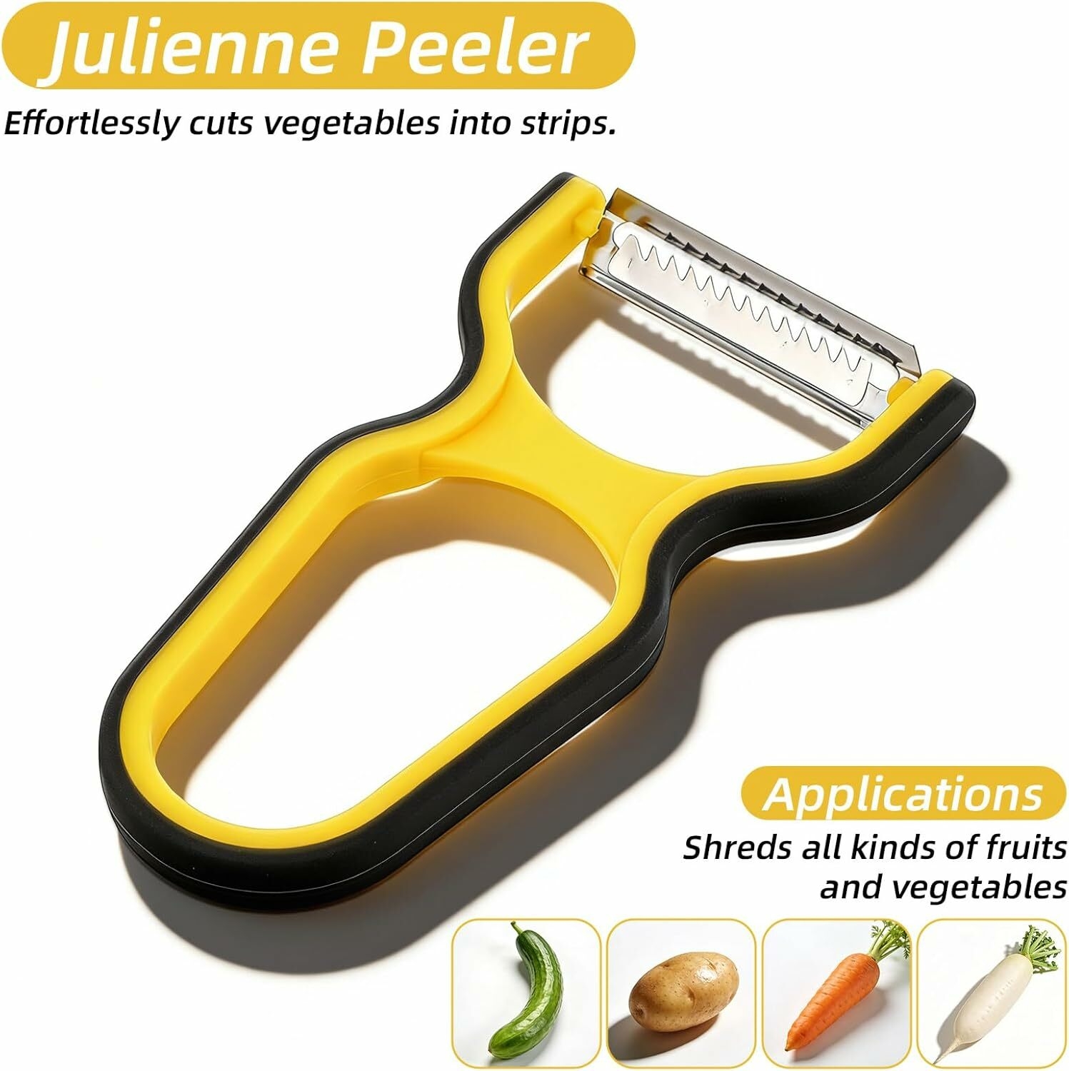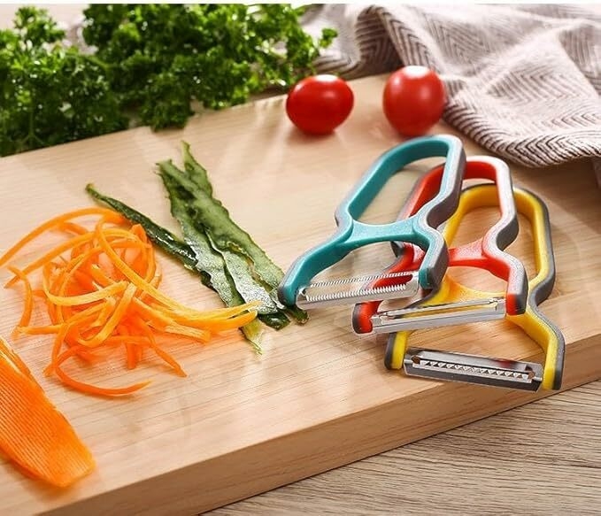 3-in-1 Peeler Set: Peelers set for kitchen can easily handle a variety of kitchen tasks. The straight peeler is used to peel the ordinary outer skin of vegetables and fruits; the serrated peeler is used to peel soft or waxy ingredients such as tomatoes and peaches; and the shredder peeler can cut ingredients into thin strips for use in salads, garnishes, or stir-fries