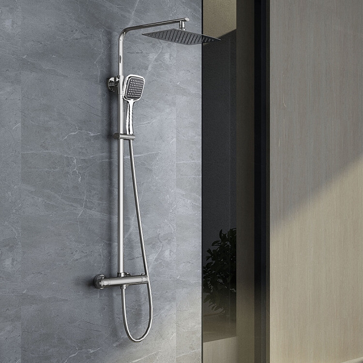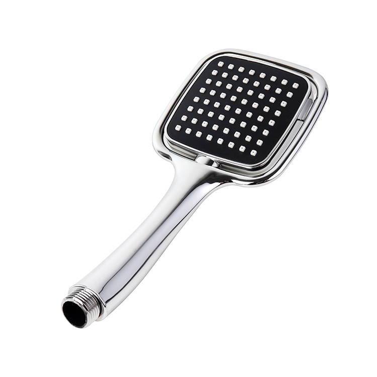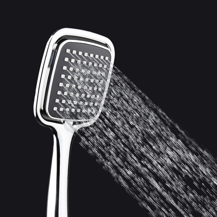 The product is a chrome‑finished handheld shower spray set with a square black nozzle featuring multiple spray jets. It includes a flexible corrugated hose, a control valve, and mounting accessories for easy installation onto an existing water supply. The kit is packaged in clear plastic with “SHOWER” labeling and comes with all fittings for a simple DIY bathroom upgrade.