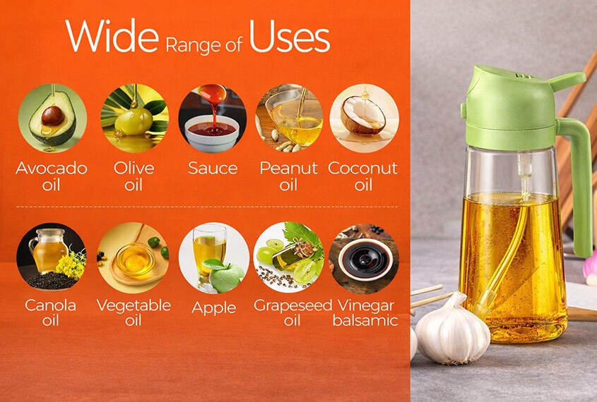 This 470ml glass olive oil sprayer is designed for convenient and efficient kitchen use. Featuring a dual-function spray and pour design, it allows users to control oil usage easily for healthier and cleaner cooking. Made with food-grade BPA-free materials and durable lead-free glass, it is safe, reusable, and suitable for everyday cooking needs such as salad dressing, frying, roasting, and grilling.