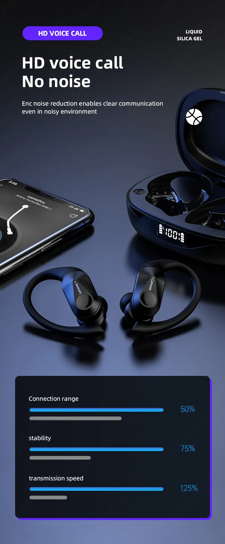 6. Environmentally friendly liquid silicone ear hook design: The LP-75 Bluetooth earphones adopt an environmentally friendly liquid silicone ear hook design, which can be adjusted from multiple angles and can more stably adapt to different sports environments.