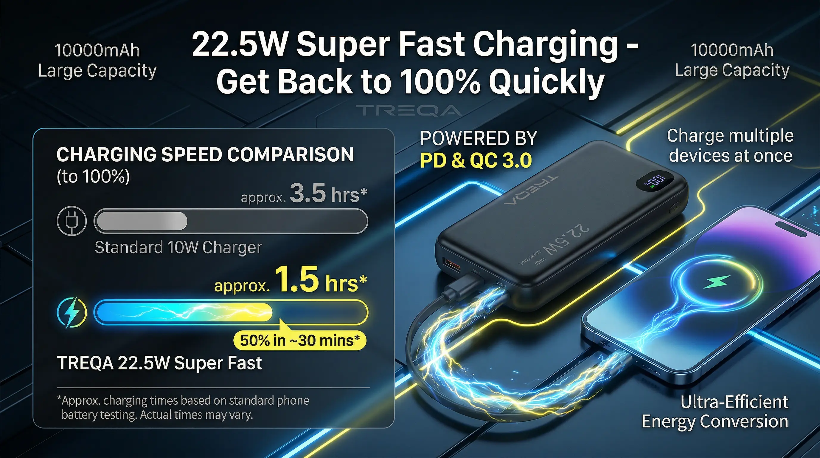 This power bank for phone charges an iPhone 15 Pro to 60% or a Samsung S24 to 50% in 30 minutes, while AniFast tech powers you up fast with no time wasted.