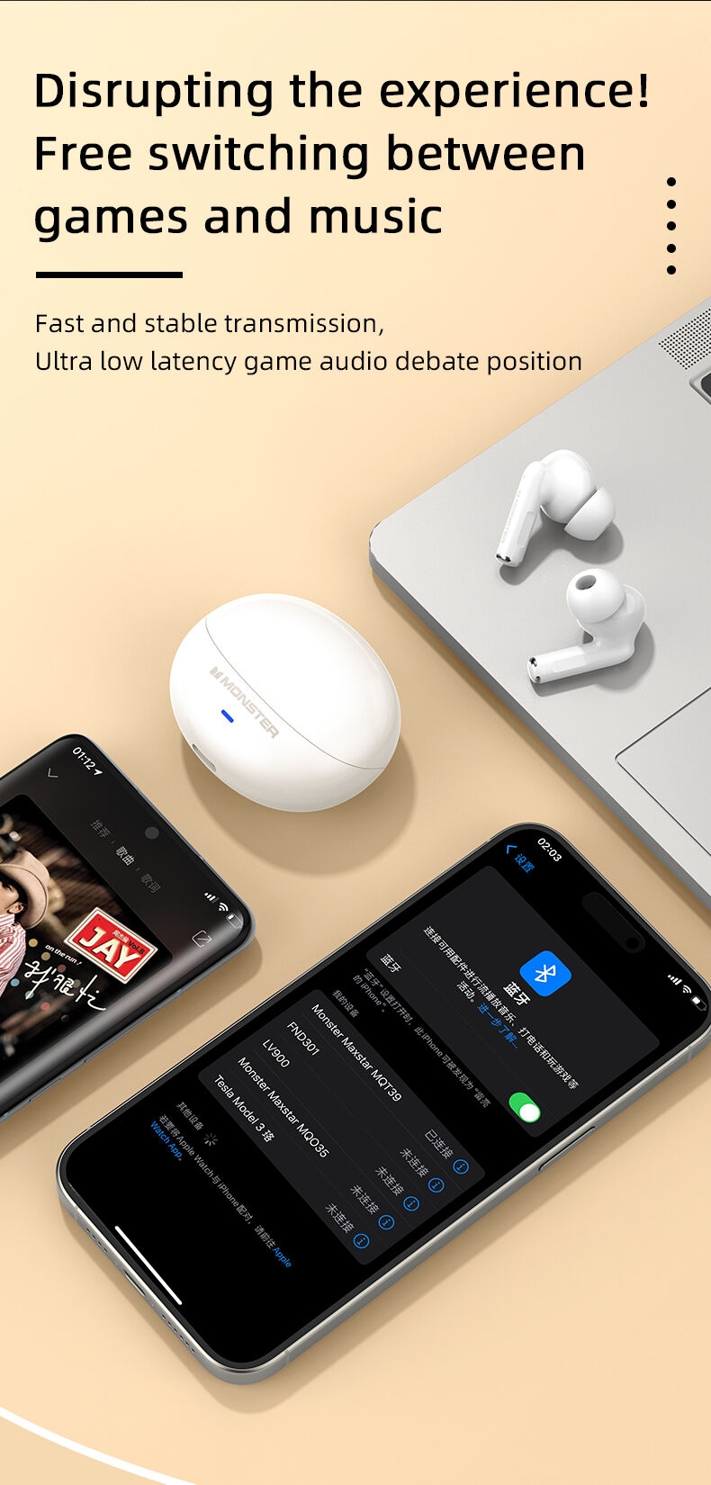 Monster MQT39 Wireless Bluetooth 6.0 Earphones TWS Hifi Stereo Wireless Headphones Gamer Headset Noise Reduction Sports Earbuds