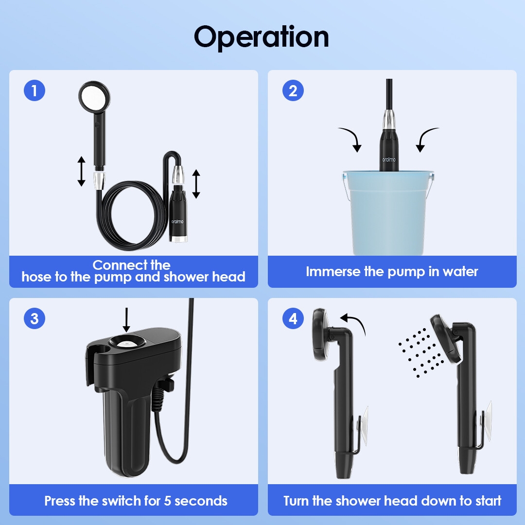 Attach the shower to a car window or bathroom wall with the suction hook. Hang the shower on a tree branch or other places with the S-hook.
