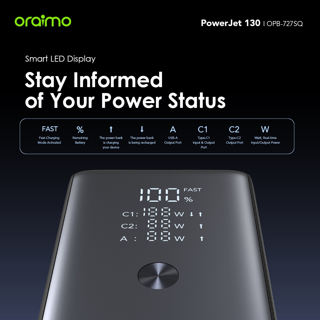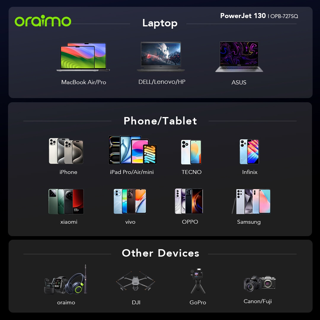 *Oraimo PowerJet 130 Power Bank is compatible with more than 1,000 major devices, including Apple, SAMSUNG, Tecno, Infinix and Mi smartphones and Type-C port charging Laptops such as MacBook Pro 13"/ MacBookPro 14" / MacBook Pro 15"/MacBook Pro 16"/MacBook Air Series; HP Spectre/ Zbook; Google Pixelbook; Dell/Google Pixelbook/Microsoft Suface Book/ThinkPad and more.