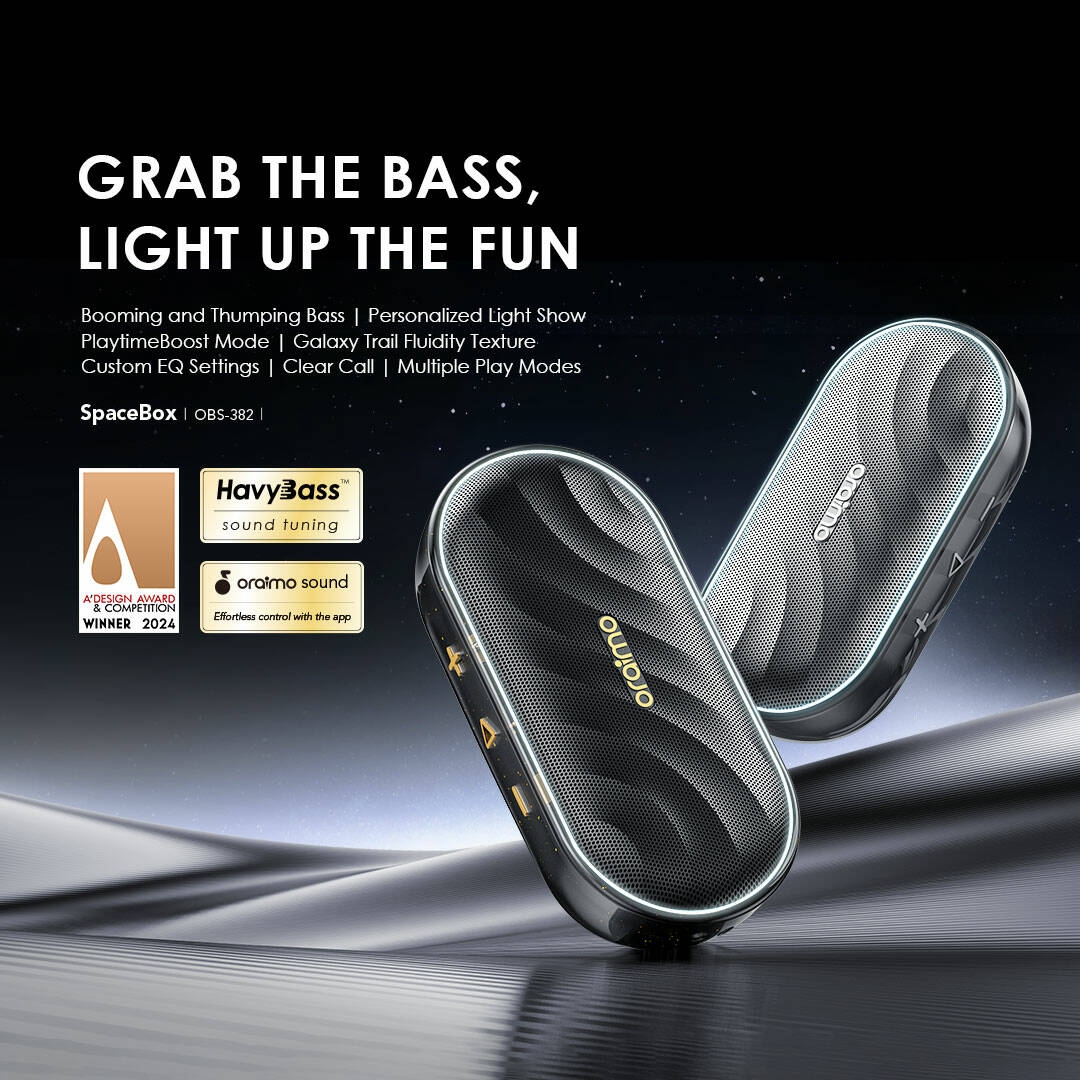 The Bluetooth Speaker delivers powerful oraimo Pro Sound with impactful bass in a compact design, featuring professional acoustic engineering and exclusive HavyBass™ technology.