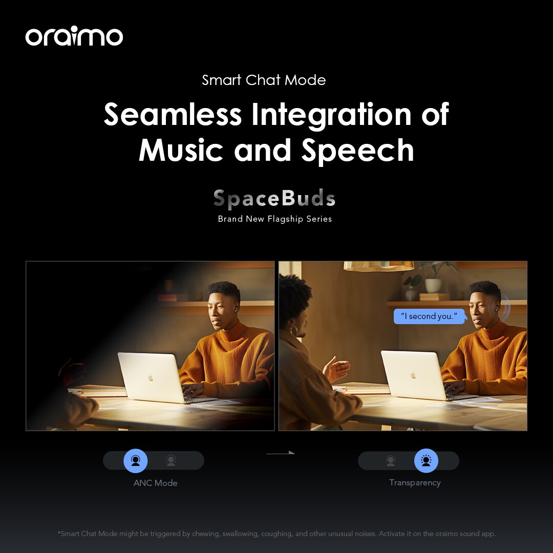 *Smart Chat Mode might be triggered by chewing, swallowing, coughing, and other unusual noises. Activate it on the oraimo sound app.