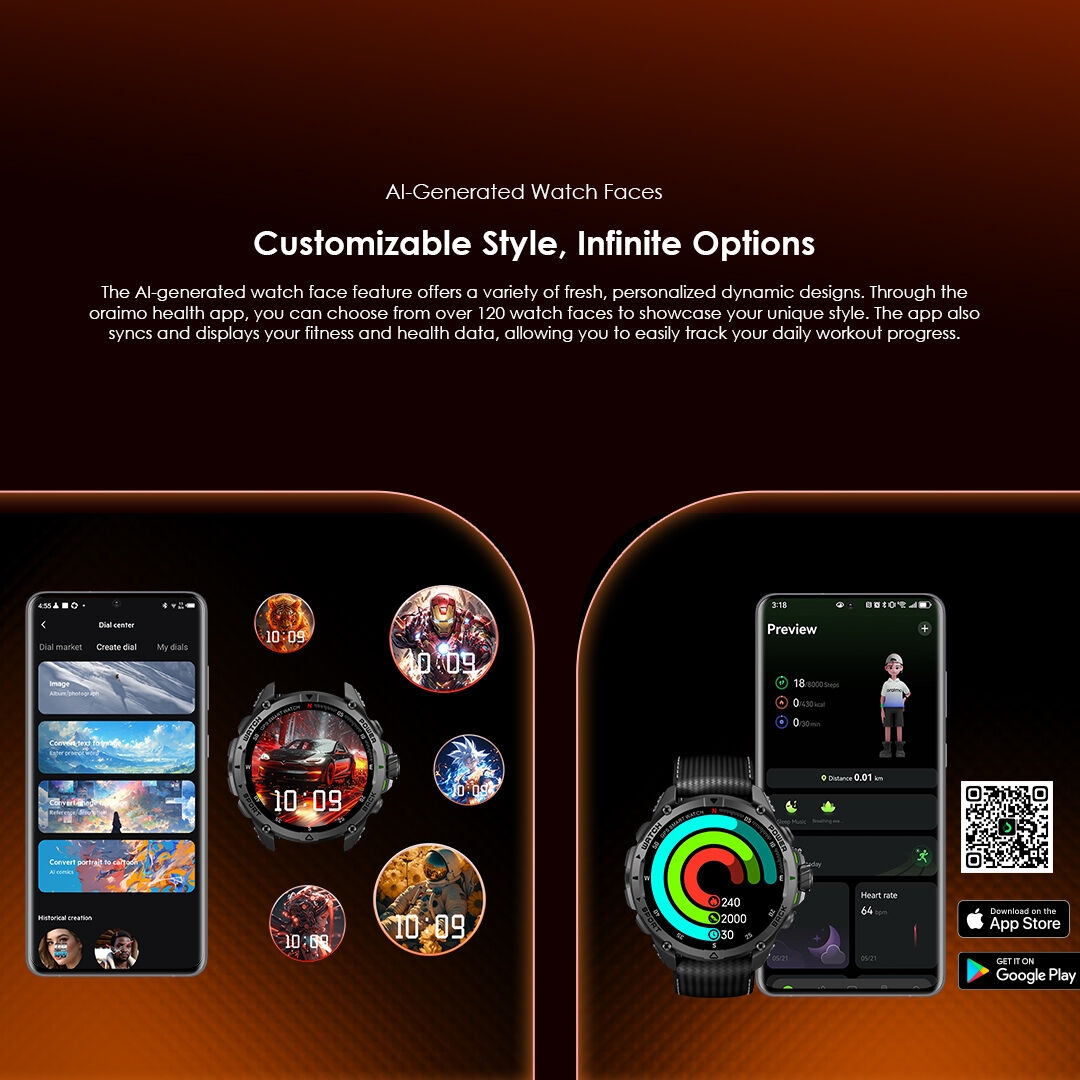 The AI-generated watch face feature offers a variety of fresh, personalized dynamic designs. Through the oraimo Health app, you can choose from over 120 watch faces to showcase your unique style. The app also syncs and displays your fitness and health data, allowing you to easily track your daily workout progress.