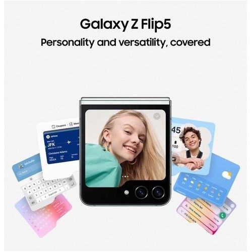 Galaxy Z Flip5 debuts a 3.4-inch Flex Window built for self expression.1 Compact and eye-catching from every angle, this foldable is as versatile as it is portable.