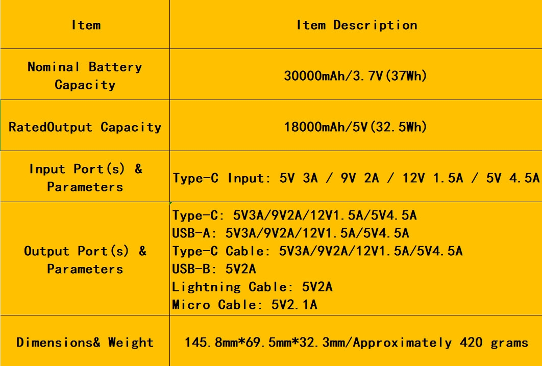 ● The rated total capacity of the power bank's internal battery cells (e.g., 30000mAh) is measured at 3.7V.