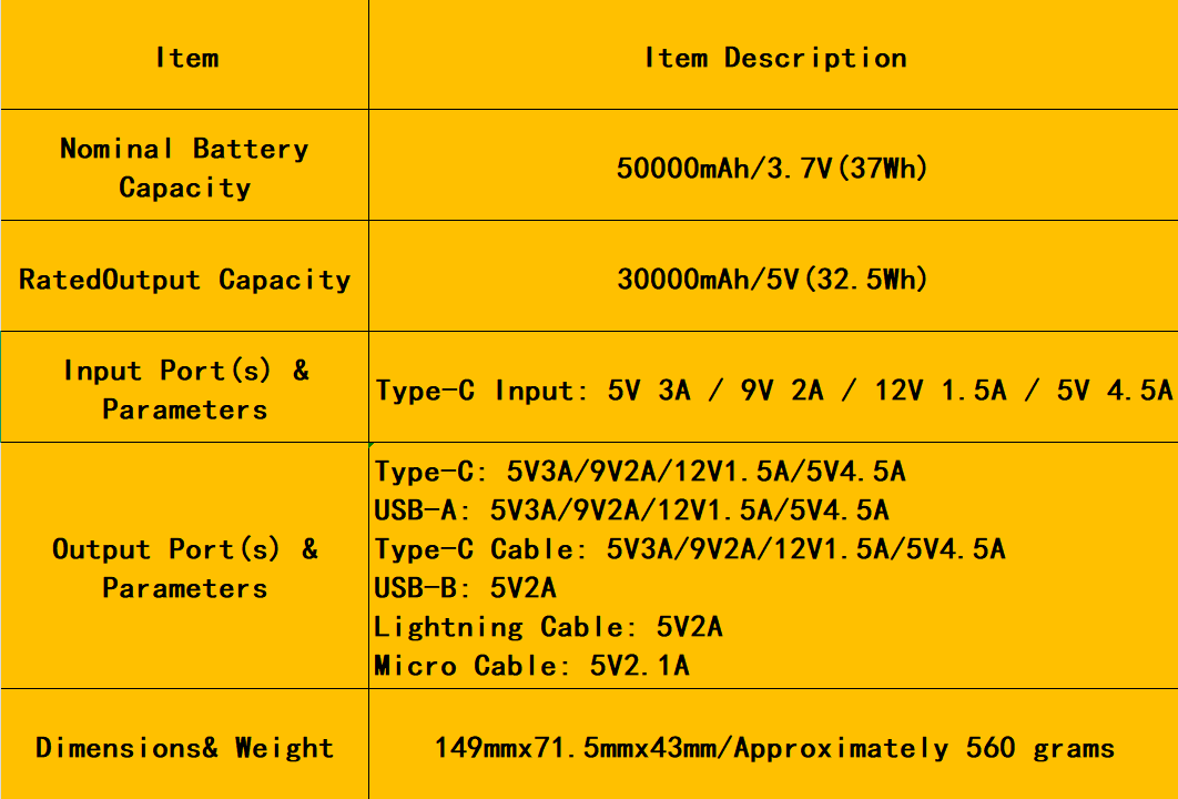 ● The rated total capacity of the power bank's internal battery cells (e.g., 50000mAh) is measured at 3.7V.