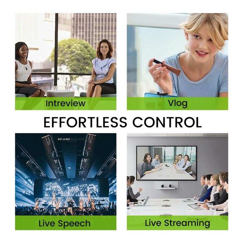 • Plug-and-play setup with automatic pairing between microphones and receiver.