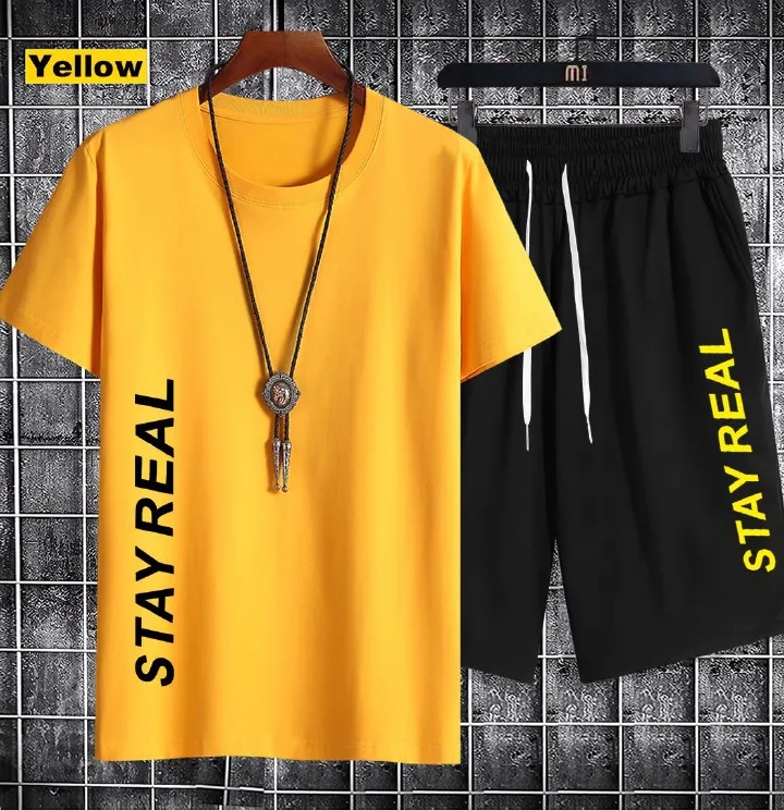 This is a very stylish men's crew neck short sleeve T-shirt set (2 piece set) top + pants. It was carefully designed
