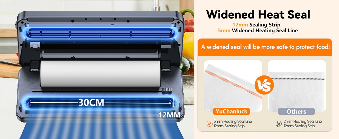 【Widened Seal and 11.8-inch Sealing Length】LED Touch Display,the vacuum sealer is designed with a 5mm widened sealing line and an 11.8-inch sealing length, can use most vacuum bags on the market. This ensures a more strong and airtight seal, preventing Liquid leakage. The LED display provides real-time feedback on the operation, with a countdown timer and error alerts to ensure smooth usage. The touch panel design allows easy operation even with wet hands, making it more durable than traditional buttons.