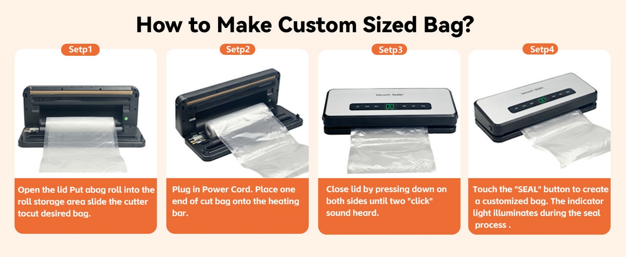 【Built-in Cutter and Bag Storage】Includes 1 Roll and 5 Pre-Cut Bags,the vacuum sealer is equipped with a built-in cutter and bag roll storage, allowing users to easily cut bags to the desired length. Additionally, the package includes one 7.9"x118" roll and twenty 7.9"x11.8" pre-cut bags, ready to use right out of the box, saving you the trouble of extra purchases and meeting your daily storage needs.